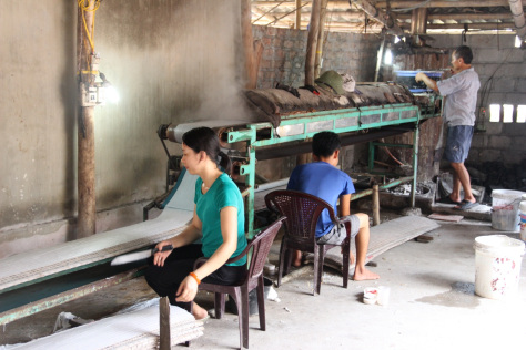 Đến 4 giờ hôm sau, người dân làng Chều sẽ cho thêm 1 lượng muối vừa đủ để bánh được dẻo và dai tùy vào tình trạng thời tiết. Tiếp đó, bột sẽ được mang ra đổ vào máy tráng. Công đoạn này cần khoảng 5 nhân công làm việc liên tục. 1 người đứng điều chỉnh độ dầy mỏng của bánh. Người này là quan trọng nhất vì phải quan sát liên tục máy hoạt động và bố trí nhân công phù hợp.